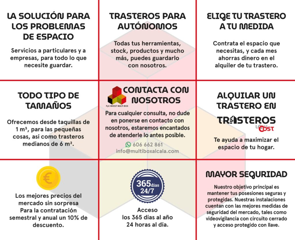 En FyC Invest Multibox Alcalá, contamos con el mejor servicio de alquiler de minialmacenes y trasteros que se adapta a tus necesidades. Ya sea que necesites espacio para herramientas, equipaje o pertenencias que no utilizas, tenemos opciones para ti. Nuestros trasteros están vigilados las 24 horas, brindando la máxima seguridad para tus pertenencias. Nos dirigimos a particulares, empresas y autónomos, ofreciendo las tarifas más bajas del mercado.
